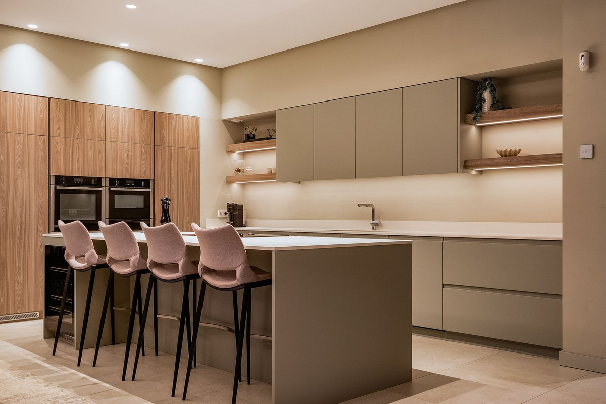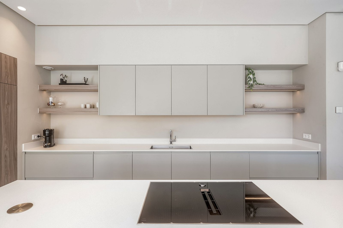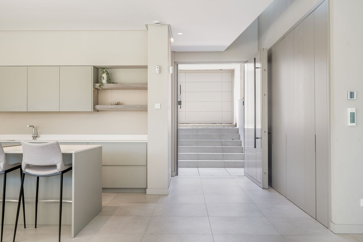 The main floor holds the integrated kitchen and living room. This area offers plenty of light and opens up towards the terrace which further offers beautiful sea and mountain views. T