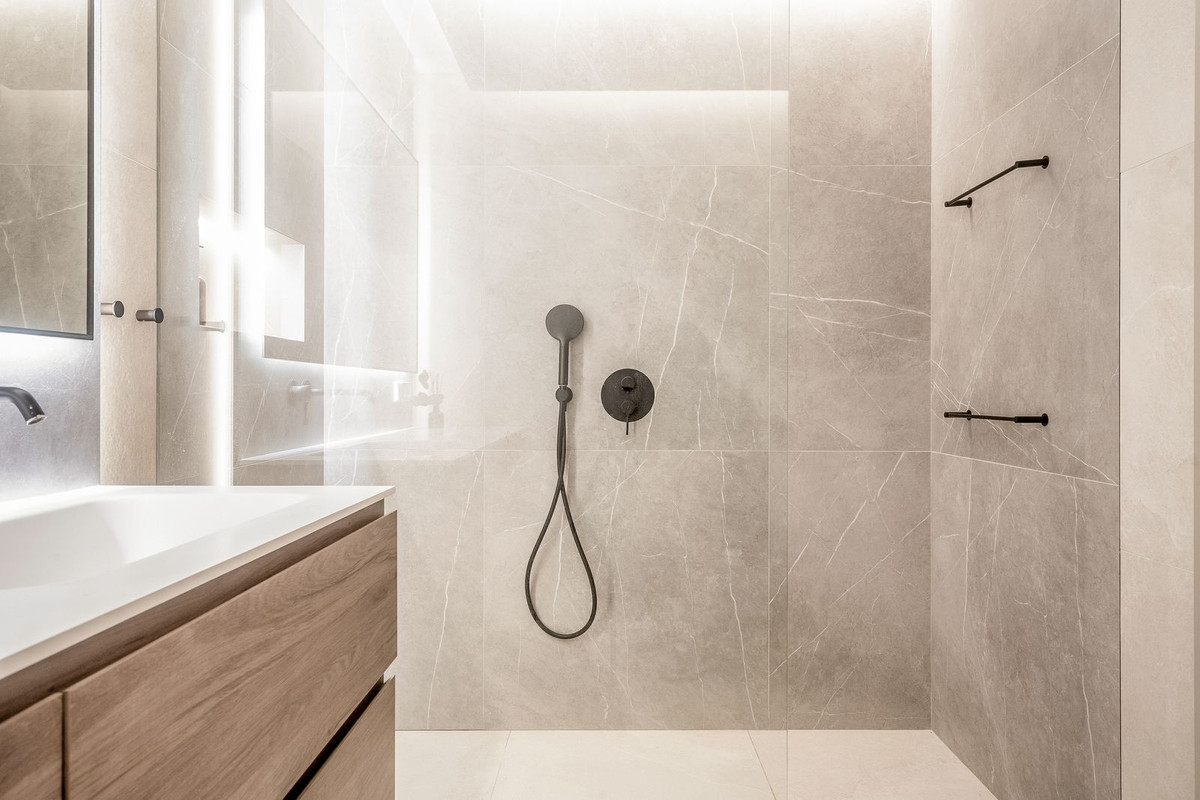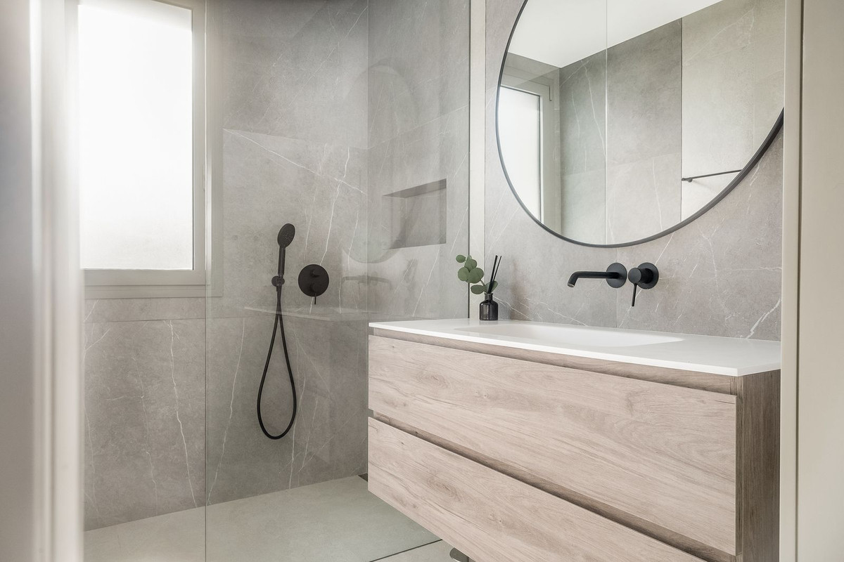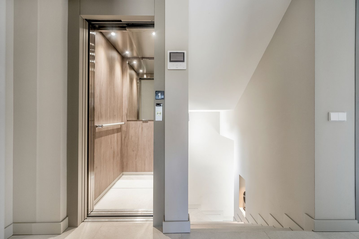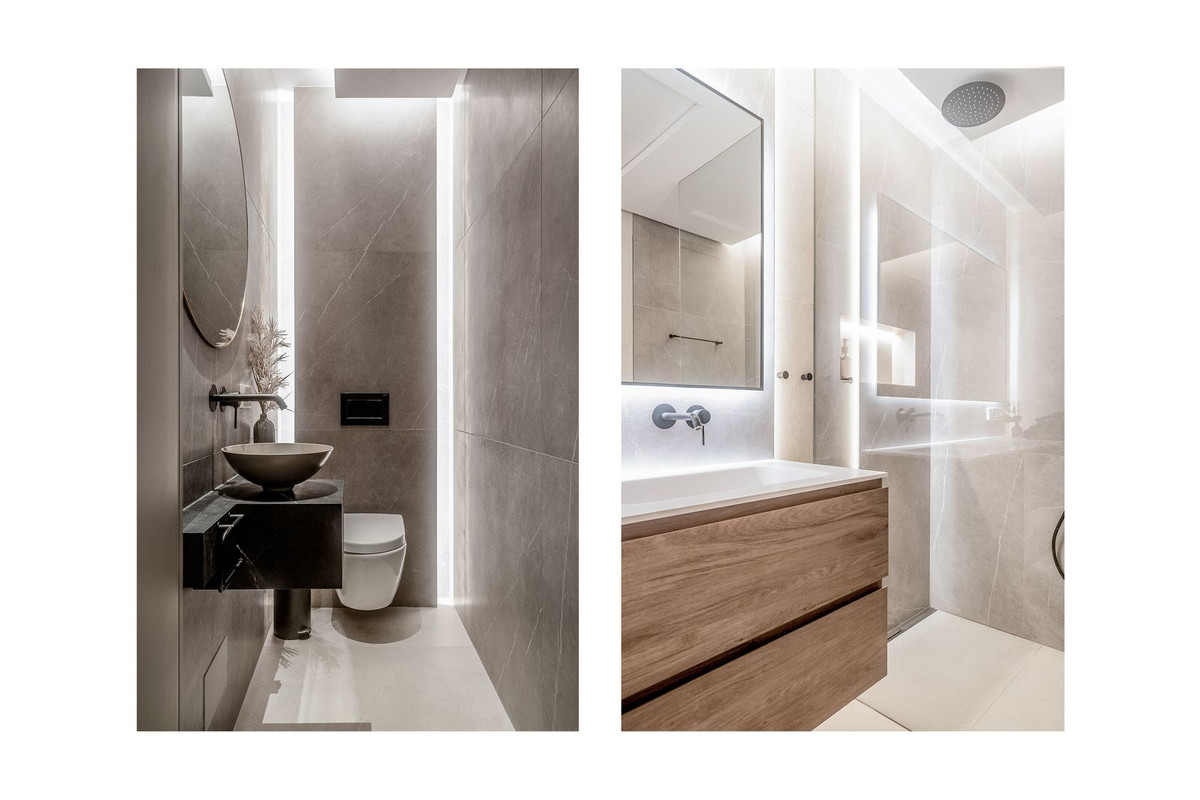 The main floor holds the integrated kitchen and living room. This area offers plenty of light and opens up towards the terrace which further offers beautiful sea and mountain views. T